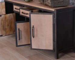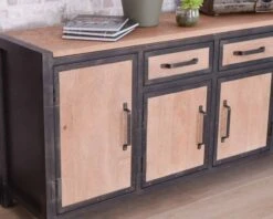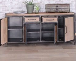 Le grand buffet 2 tiroirs 4 portes « Saturne » présente un design industriel respecté dans ses moindres détails. L’allure du métal travaillé de manière brute, l’aspect volontairement visible des soudures et la teinte chaleureuse du bois de manguier massif aspect teck lui confèrent un style authentique qui fera merveille dans une cuisine contemporaine ou sol ciré au dans la salle à manger ouverte d’un loft à l’esprit atelier d’artiste.
