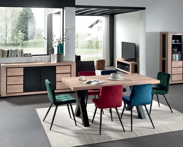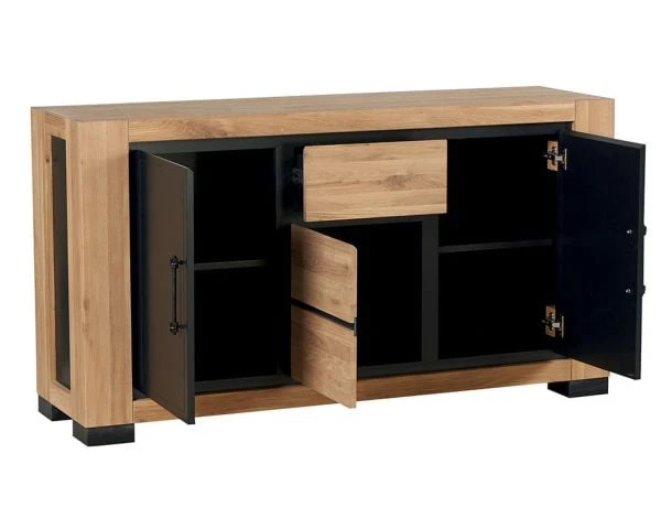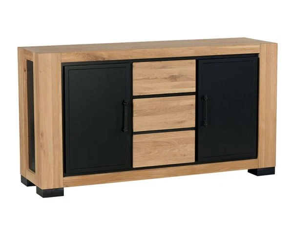 Ce bahut en chêne est très esthétique. Il allie le bois, huilé et laqué pour un effet plus fini et sophistiqué et le métal noir pour un effet industriel très moderne. L’alliance de ces deux matériaux lui confère un style original qui s’accordera avec tous vos intérieurs, quels que soient vous goûts en matière de décoration et quelle que soit la pièce dans laquelle vous souhaitez intégrer votre nouveau mobilier. Avec ses trois portes et son tiroir, notre bahut bois massif a une grande capacité de rangement. Vous pourrez donc y stocker toutes sortes d’objets de tailles et de poids différents, facilement accessibles.