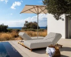 Grâce au design gracieux et tendance de votre transat, vous profitez d’un meuble exceptionnel sur votre terrasse. Conçu en teck massif, aluminium et recouvert d’un textile hydrofuge Sunbrella® gris clair, il sera l’allié indispensable de vos séances « bronzage ».