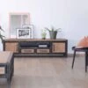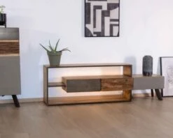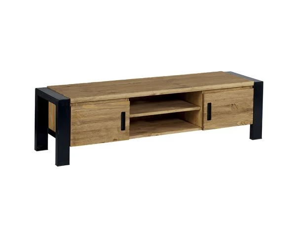 Beau meuble tv plasma en pin massif brossé et métal. Ce meuble TV est constitué de 2 portes non coulissantes et de deux niches sur le milieux afin d’accueillir votre appareil hifi. Ce meuble télé vous aaportera du rangement supplèmentire grâce à ses portes où vous pourrez y ranger vos DVD, vos livres et autres.