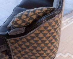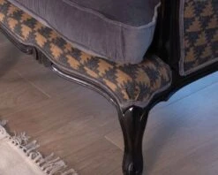 Sur les bras du fauteuil, de fins accoudoirs en tissu uni ajoutent une touche sophistiquée et confèrent à ce meuble un cachet qui fait écho à la finesse des détails et à l’attention portée à sa réalisation.