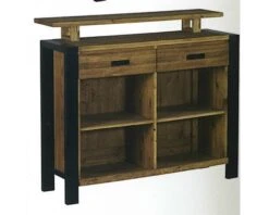 Convivialité et détente sont de rigueur. Pour vous organiser ce meuble bar industriel en pin massif brossé possède 2 tiroirs et 2 étagères à l’arrière. Avec ses petites dimensions, il trouvera facilement sa place dans votre intèrieur.