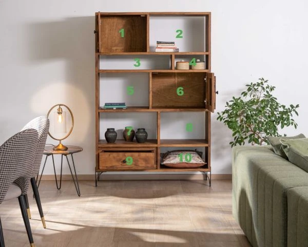 Vos plus beaux livres, objets souvenirs et décoratifs se retrouvent au centre d’un théâtre majestueux dans cette bibliothèque en acacia massif de la collection « Membatu ».