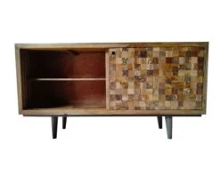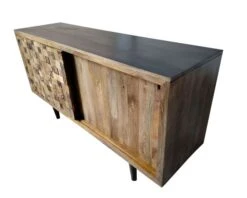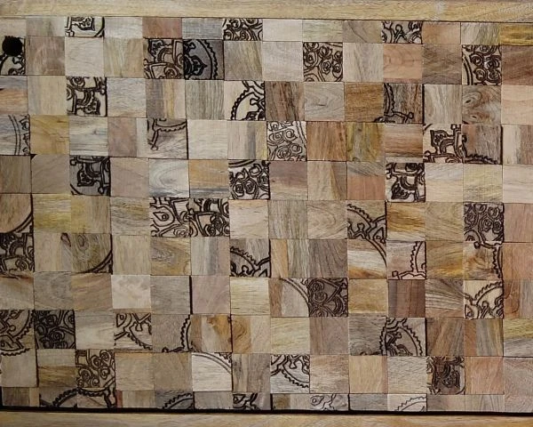 La mosaïque de bois aux riches nuances donne un côté très chaleureux à votre meuble et l’originalité de ses deux poignées en font un meuble de séjour unique. Présenté comme un ouvrage d’art, votre buffet bas invite au voyage dans les lointaines contrées asiatiques.