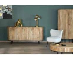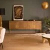 Entre ses poignées boutons, ses pieds cylindriques en métal noir et la teinte miel pleine de nuances du bois massif de manguier, l’enfilade post vintage sera sublimée par des murs aussi bien clairs que colorés. Le vert mat kaki pourra très bien lui convenir par exemple. Sur le plateau pourquoi ne pas disposer à chaque extrémité deux lampes avec abat-jours noirs ? Au centre du mur un élégant miroir géométrique au cadre doré sera parfait.