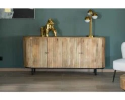Livré assemblé, ce meuble de rangement faussement vintage n’aura besoin que de se voir fixer ses pieds en métal noir. Elégant et moderne à la fois, ce grand buffet bas ne manquera pas de meubler avec raffinement votre intérieur. C’est un meuble solide qui conviendra aussi bien à un usage quotidien que moins fréquent. Ses portes fermées par aimants protégeront idéalement vos différentes affaires. Dans une colocation, il pourra pourquoi pas aussi servir de grand meuble TV. Sur le long plateau, votre écran trouvera parfaitement sa place. Il est toujours amusant de détourner la fonction première d’un meuble voir même d’en combiner deux pour les espaces à taille plus restreinte.