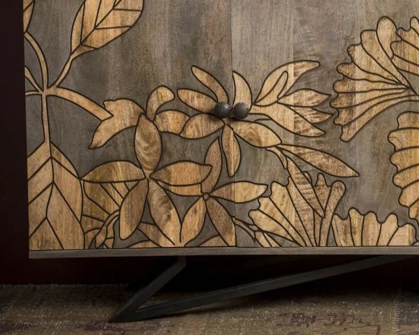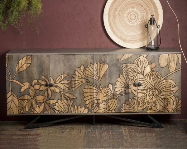 Cette longue enfilade aux références art déco est une pièce issue d’une production confidentielle réalisée par des menuisiers indiens certifiés. Issu d’une petite série, il sera aussi rare et précieux que les belles fleurs exotiques qui fardent ses portes.