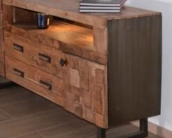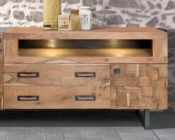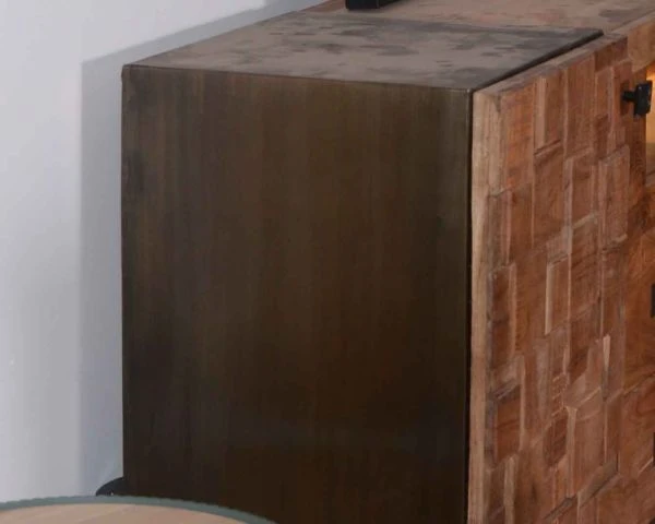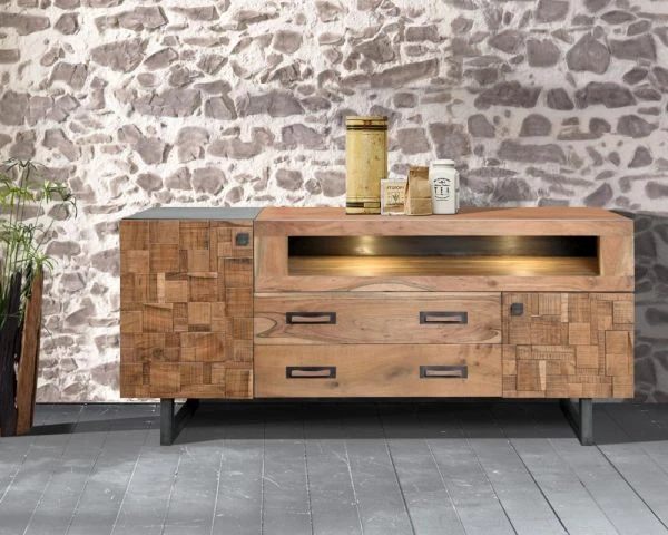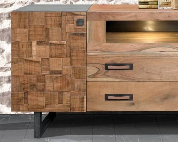Très esthétique et original, notre buffet bas en acacia sera sans nul doute une pièce maîtresse de la décoration de votre intérieur. A la fois pratique grâce à sa capacité de rangement et esthétique, il saura attirer le regard de vos invités. Apportez-y une touche finale en déposant sur son beau plateau bi-matière de beaux objets décoratifs comme un vase en verre soufflé. Le bois de ce meuble est travaillé de manières différentes. En effet, les portes des deux placards sont texturées façon « damier en bois », alors que les façades des tiroirs et l’encadrement de l’étagère sont parfaitement lisses. Cet harmonieux contraste renforce la personnalité de ce buffet tout comme ses côtés teintés foncés et une partie du plateau supérieur.