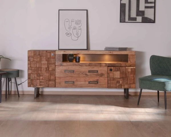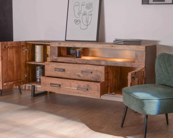 Dans la collection « Queens », nous vous proposons ce magnifique buffet de salle à manger en bois exotique massif et métal. Ses belles dimensions (L. :175 cm, P. : 40 cm, H. : 77 cm) offrent une grande capacité de rangement. Doté d’une étagère ouverte à encadrement bois éclairée par des LED sur sa partie supérieure, de deux tiroirs ainsi que de deux placards latéraux aux dimensions différentes, cette longue enfilade en bois massif posée sur pieds métalliques vous offre de multiples options d’organisation. Le plateau du dessus se compose de deux parties distinctes: la première et la plus grande est en bois, la seconde en métal.