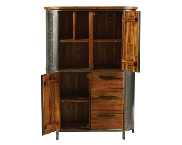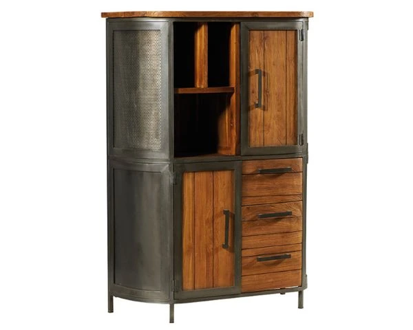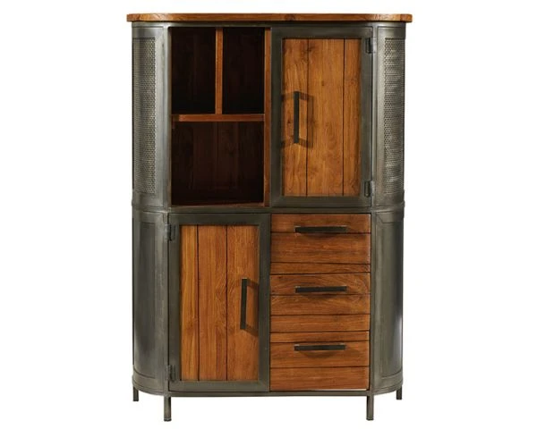 Avec sa combinaison de teck et de métal et son style industriel, ce buffet haut vous permettra d’accueillir vos objets de décoration dans les niches et de ranger vaisselle, documents, livres… dans ses 2 placards et ses 3 tiroirs montés sur rails métal à ouverture totale. Design, ce meuble de 144 cm de haut plaira aux amateurs de décoration marquée et tendance.