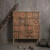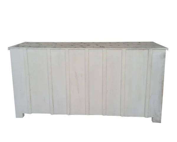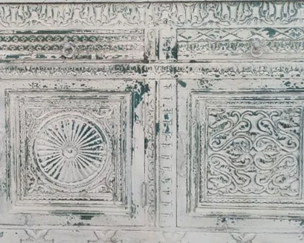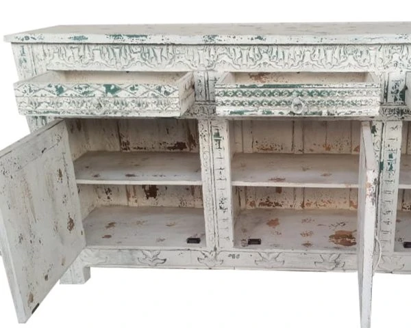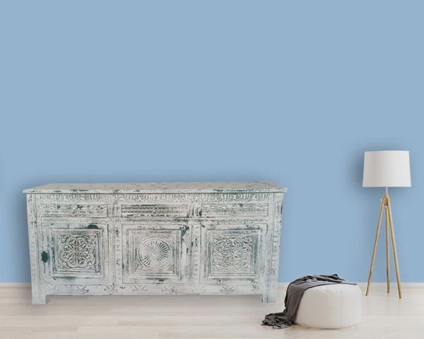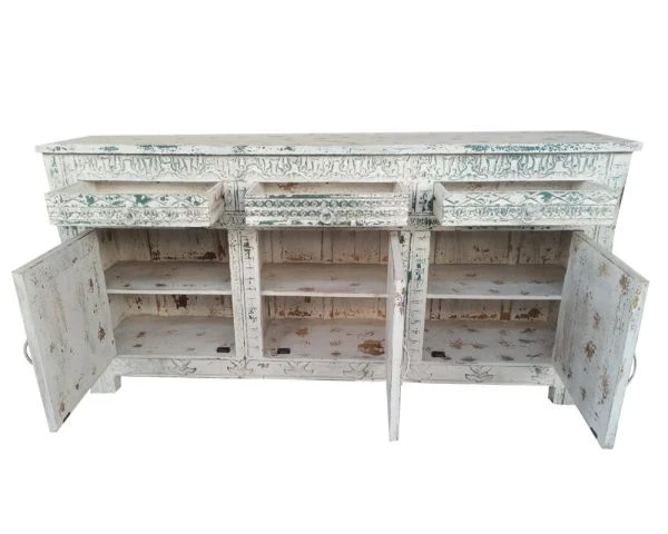 Les façades des portes et des tiroirs sont le point de départ de la construction de ce meuble de salle à manger. La caisse du meuble a été pensé autour des dessins ornementaux puis l’ensemble a été patiné à la main. Les teintes blanchies, la patine et les marques authentiques et nuancées brunes, vertes, bleues… sont la preuve de l’unicité de votre nouveau bahut. Ce buffet indien est une pièce unique de manufacture artisanale : vous ne trouverez nulle part ailleurs un mobilier similaire.