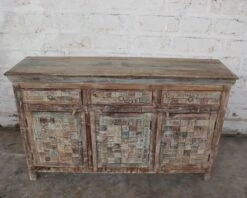 Avec des dimensions de 150 x 40 x 90 cm (longueur x profondeur x hauteur), ce bahut indien est une pièce authentique, 100% unique. Les façades de ses 3 tiroirs et de ses 3 portes sont ornées de petites poignées en métal rondes mais surtout de détails gravés délicieusement ouvragés. Ces détails ont été upcyclés à partir de frises indiennes et de bois colorés récupérés dans d’anciennes maisons indiennes désertées et abandonnées du Rajasthan.