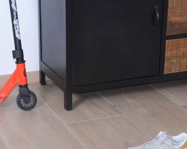 Entre son caisson, ses poignées et ses pieds en métal, votre nouveau meuble de rangement dispose d’une allure pleine de personnalité et d’un look factory très prisé en décoration. Le piétement du buffet légèrement réhaussé, vous permettra de nettoyer aisément autour et sous votre bahut.