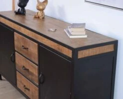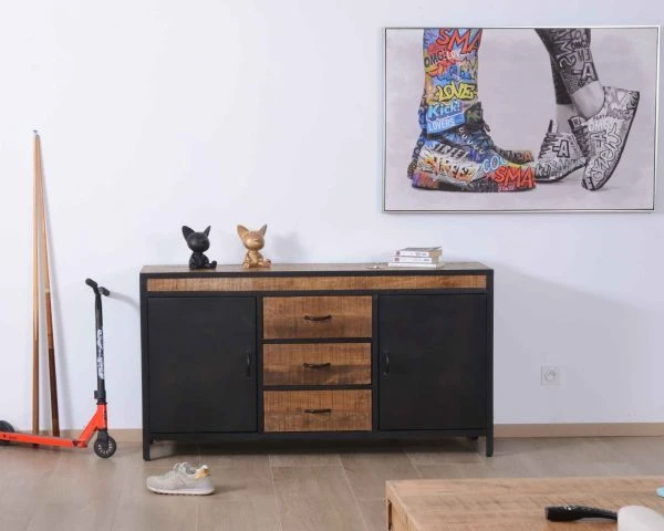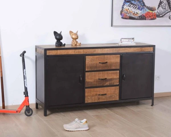 Avec ses dimensions raisonnables mais généreuses (L. 150 x H. 80 x l. 45 cm), ce magnifique buffet bas métal et bois s’intègrera très facilement à votre univers et à vos meubles déjà en place. Qu’il soit marié à des éléments de déco modernes, chinés ou de style indus’, il vous aidera à créer un espace de vie décoré avec beaucoup de tempérament et de puissance.