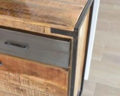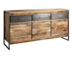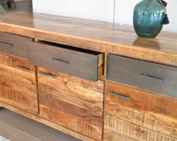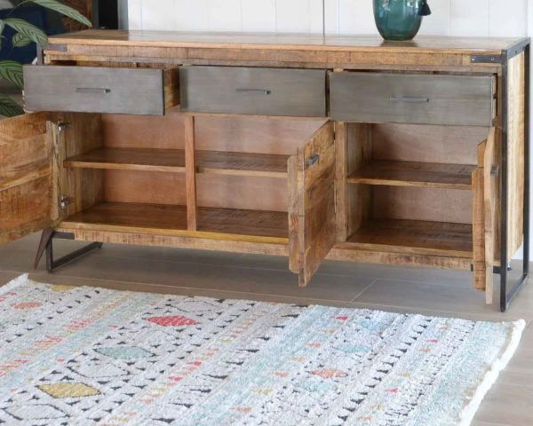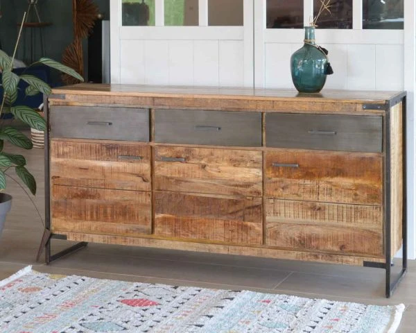 Ce buffet bas de la collection « Shade » assume pleinement son design factory. Et oui, le style industriel séduit encore et toujours… Réalisé à partir de métal, de MDF et de bois de manguier massif, il affiche un cachet dont vous ne vous lasserez pas. Doté de pieds géométriques originaux qui soutiennent le caisson de façon efficace, le buffet 3 portes 3 tiroirs « Shade » a de l’allure ! On adore ses détails, son bois nuancé et son travail de soudure brut apparent qui apporte encore plus de cachet.