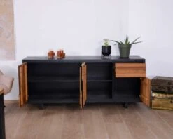 Mixant avec habilité deux bois massifs, le bahut 4 portes 1 tiroir « Flix » se farde d’une teinte naturelle et d’un coloris noir. Avec élégance et efficacité, les couleurs se mixent pour vous subjuguer. Le pin massif teinté foncé fait magnifiquement ressortir la nuance traditionnelle du chêne huilé.