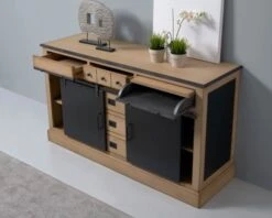 Quand organiser ses affaires devient un plaisir, il est de bon ton d’avoir un buffet solide aux multiples rangements. Grâce à ses 5 tiroirs, son pupitre et ses deux placards latéraux avec portes coulisantes, ce superbe buffet en chêne teinte crème brûlée a tout bon. On est fan de ses finitions et de son allure imposante mais raffinée à la fois. A droite, le module secrétaire vous permet d’écrire quelques missives ou vous permet aussi de déposer vos couverts le temps de les frotter à l’aide de votre torchon avant de dresser votre table. Ne perdez plus de temps à rassembler plusieurs meubles dans votre pièce de vie et centralisez vos affaires dans du mobilier aussi beau que pratique.