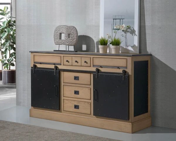 Livré monté en 2 colis, votre nouveau buffet bas métal et bois massif, sera idéalement mis en valeur devant un mur gris clair ou blanc. La lumière naturelle saura mettre en beauté la patine déposée manuellement sur le chêne. Admirez le veinage du bois qui contrebalance l’aspect plus dur du fer noir brossé. Fabriqué avec soin et dans le soucis du détail, votre meuble de salle à manger ou de cuisine de 165 cm de long sublimera à lui seul votre pièce de vie. Et pour un ensemble cohérent et harmonieux, n’hésitez pas à l’accompagner d’autres éléments de la même gamme. Si vous souhaitez réaliser une composition de plusieurs éléments, renseignez-vous auprès de notre service commercial, par téléphone ou par mail. Il sera à votre écoute et vous guidera dans toutes les étapes afin de réaliser votre projet sur-mesure.