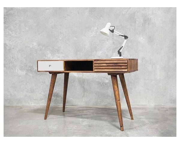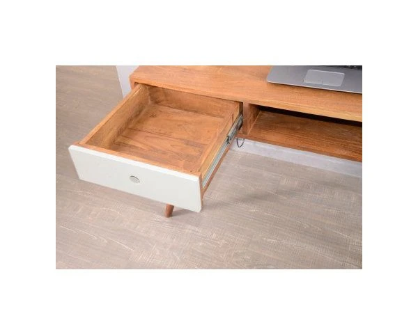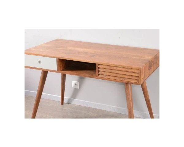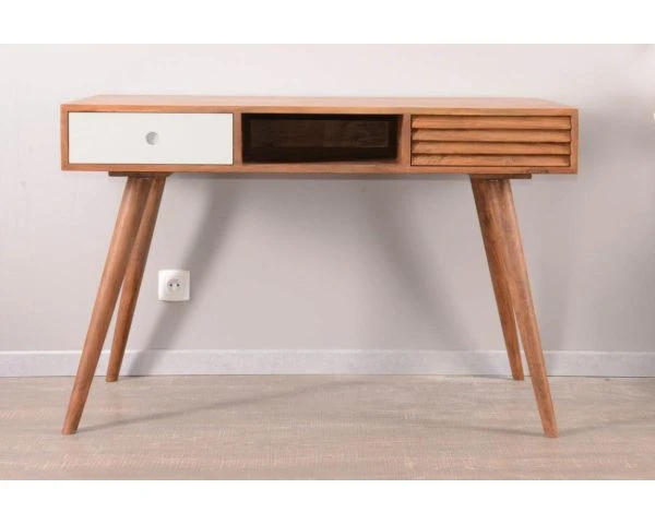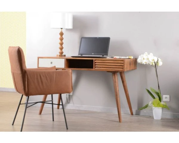 Avec ses dimensions de 117 x 60 x 75 cm (LxPxH), votre meuble trouvera facilement sa place dans un petit coin du salon aménagé en zone de travail, sur un palier lumineux ou dans l’angle d’une chambre ou d’une véranda par exemple. Votre meuble sera à la fois une pièce utile et déco, vous qui aimez travailler tout en restant tendance, c’est parfait, avouez-le ! Le traitement du MDF blanchi pour le tiroir de gauche apporte la touche de modernité à ce superbe bureau en bois que vous pourrez utiliser très régulièrement. Entre ses lignes élégantes et son bois exotique, votre meuble passera l’épreuve du temps sans crainte et vous pourrez toujours l’accessoiriser par des sets d’écriture de couleurs différentes pour changer votre déco à moindre frais.