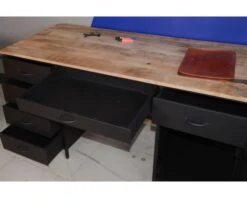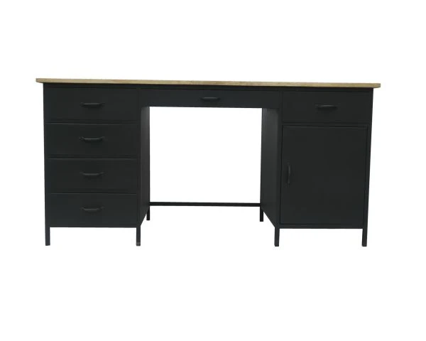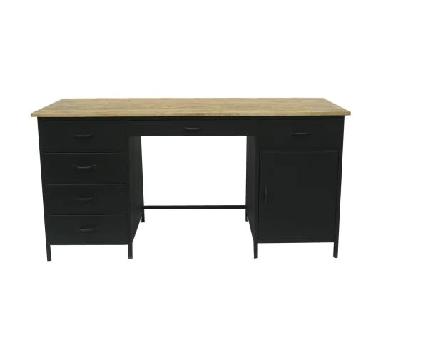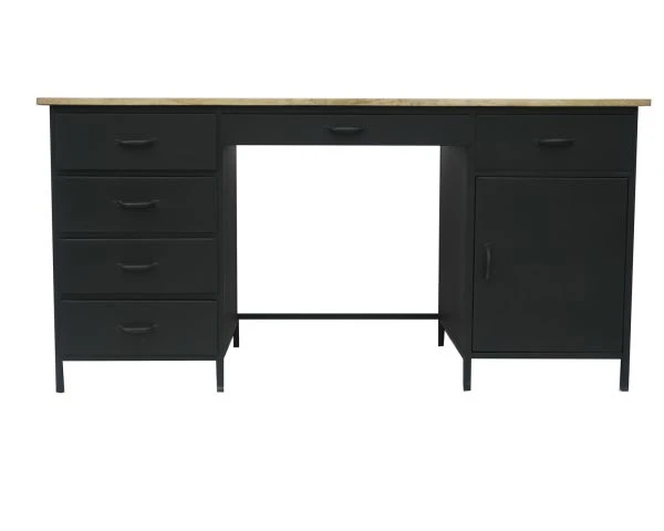 Ce bureau style industriel rappelle le mobilier des ouvriers des années 60. Très fonctionnel, ce meuble comporte quatre tiroirs à gauche, un au milieu et un autre à droite d’une grande profondeur. Les poignets des tiroirs sont simples pour une esthétique très épurée. Idéal pour ranger les fournitures de bureau, la papeterie, mais aussi des classeurs dans l’espace plus libre qu’offre la porte de droite. Ce bureau est particulièrement recommandé pour les tâches administratives mais peut être transformé en bureau d’atelier dédié à des activités artisanales et d’arts plastiques.