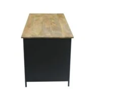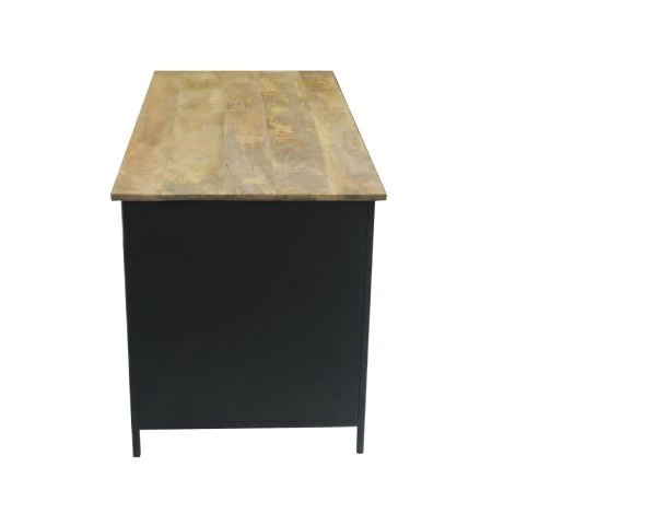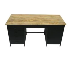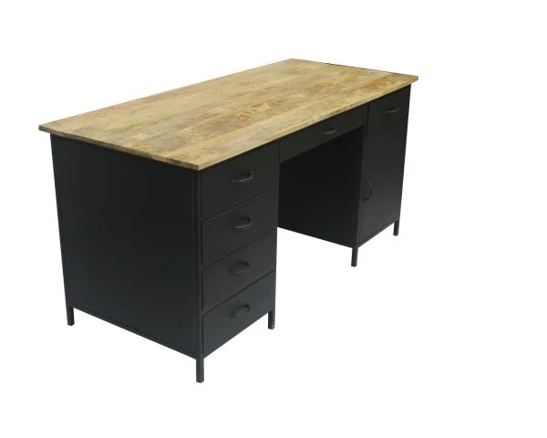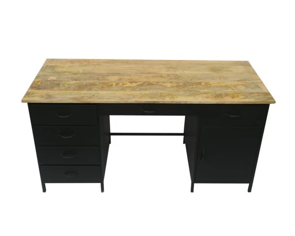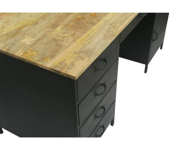 Le plan de travail très spacieux (1m 60) de ce bureau est en bois massif exotique. Les nuances jaunes du bois viennent adoucir le métal peint en noir mat. Le plateau en manguier rappelle les arbres tropicaux et les paysages insulaires: le style exotique, indien ou oriental fera le charme de votre intérieur. Ce contraste avec l’esthétique loft du métal est une vraie tendance ! L’effet vieilli du bois ajoute également un effet vintage séduisant très actuel.