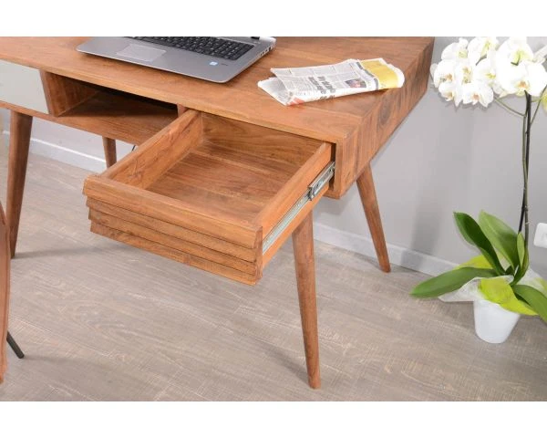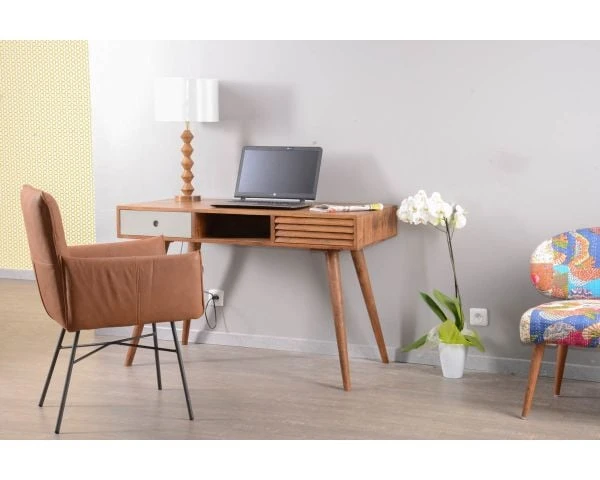 Avec des dimensions agréables de 117 x 60 x 75 cm (longueur x profondeur x hauteur), votre meuble trouvera aisément sa place dans un angle du salon aménagé en espace de travail, sur un palier bien éclairé ou dans un recoin d’une véranda ou d’une chambre par exemple. Votre mobilier sera à la fois une pièce déco et très utile, vous qui aimez travailler avec classe, c’est idéal, avouez-le ! Le traitement du MDF grisé pour le tiroir de gauche apportera la note de modernité à ce délicat écritoire en bois que vous utiliserez très souvent. Entre l’utilisation de son bois exotique et ses lignes élégantes, votre meuble passera sans encombre l’épreuve du temps et vous pourrez l’accessoiriser à moindre frais en changeant vos sets d’écriture et en optant pour un organisateur à stylos de couleur par exemple…