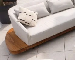 Semblant comme posé sur son socle en bois massif, ce meuble d’exception habille votre terrasse telle une œuvre d’art qu’on admire sous tous les angles. Le cadre en teck profite d’un design tout en galbe qui amplifie l’esprit accueillant et chaleureux de ce meuble conçu pour apporter un raffinement impeccable lors de vos réceptions en extérieur. Le prolongement de chaque côté de la structure en bois est aussi esthétique que pratique et permettra d’ajouter des éléments décoratifs ou simplement d’y déposer vos lunettes de soleil, votre verre ou votre magazine.
