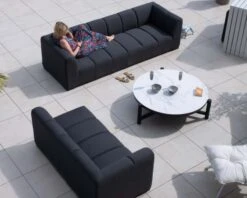 Ce canapé en retour est revêtu de l’extraordinaire tissu de la marque Française Sunbrella® dans une couleur gris foncé rehaussée de surpiqures soignées qui lui confèrent une modernité graphique. Ce textile de qualité professionnelle est réputé pour sa durabilité et sa résistance aux intempéries et à la décoloration engendrée par l’exposition aux UVs pour que votre canapé d’extérieur préserve sa beauté à travers les saisons et les années.