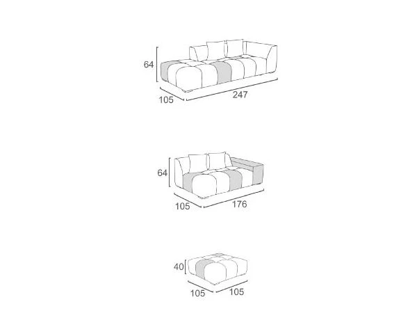 Long. : 176 cm – Prof. : 105 cm – Haut. : 64 cm – Env. 23 kg