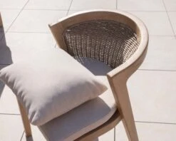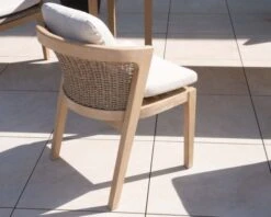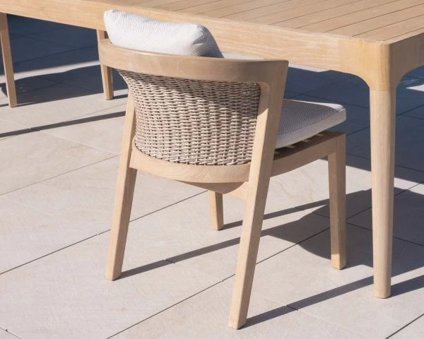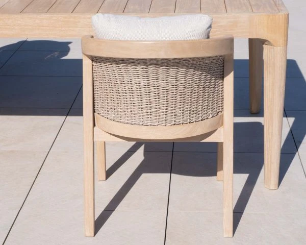 Matières : Structure teck massif, tressage textilène aspect rotin, tissu spécial extérieur écru, mousse QuickDry®