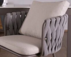 Matières : Aluminium champagne grisé, tressage textilène gris, tissu spécial outdoor écru chiné, mousse de rembourrage QuickDry