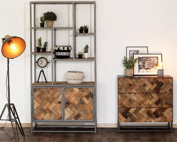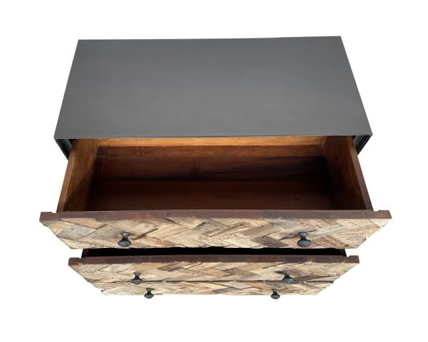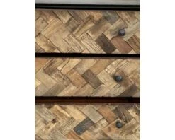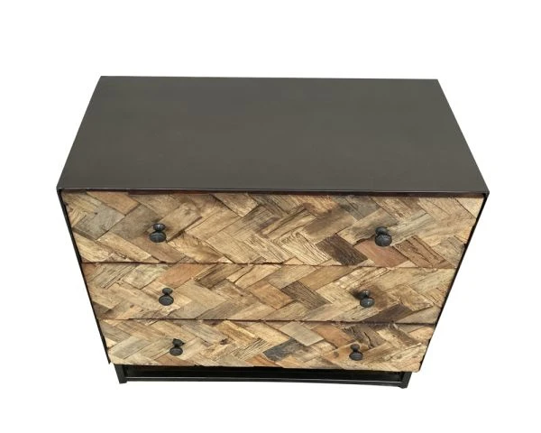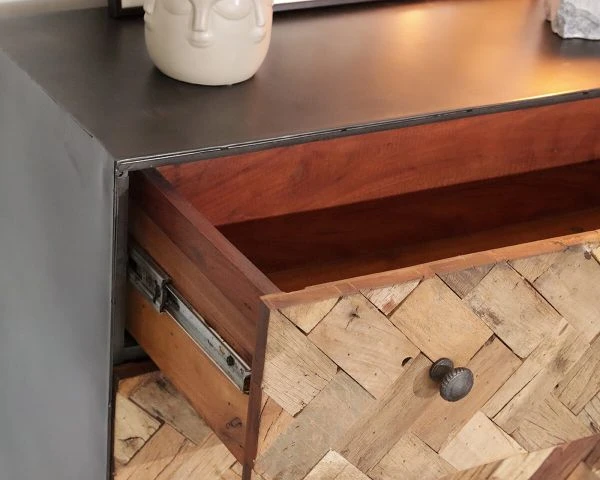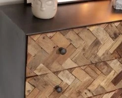 Ses tons nuancés et son graphisme en chevrons donneront beaucoup de cachet et de personnalité à votre intérieur. L’association du bois exotique et du métal offre à cette commode de chambre une allure très moderne. Le métal gris/noir anthracite lui accorde un côté industriel et le bois précieux apporte une charmante touche de fantaisie. Elle s’harmonisera aussi bien avec un intérieur aux murs clairs qu’avec un décor plus foncé dans les tons gris sourds ou vert émeraude.