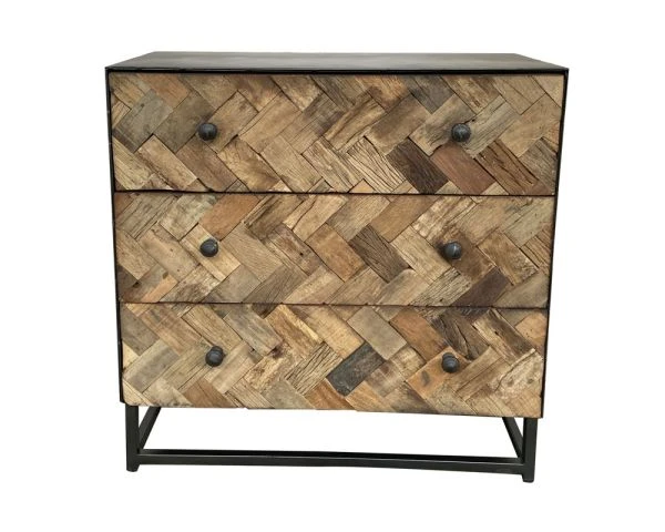 Haute de 76,5 cm, cette commode en bois recyclé est composée de trois grands tiroirs montés sur rails métalliques. Chaque tiroir est muni de deux poignées délicates en forme de boule martelée. Vous trouverez cette commode idéale pour ranger des vêtements ou des accessoires. Elle peut aussi accueillir des documents et autres papiers administratifs. Tout dépend de l’utilisation que vous souhaitez en faire et de la pièce à laquelle vous l’affectez. C’est un meuble très décoratif qui s’intégrera aussi bien avec une décoration scandinave, industrielle ou ethnique chic ! Vous pourrez même vous faire plaisir en l’associant au buffet trois portes, au vaisselier ou à la bibliothèque de la même collection à découvrir sur notre site.