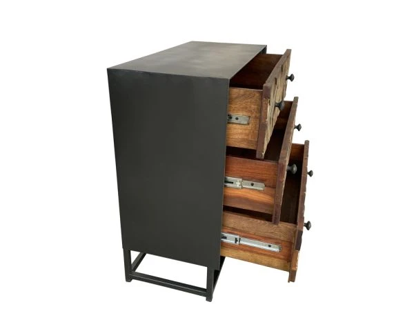 Cette commode industrielle de la collection « Kaloupilé » présente un superbe mélange de matières. Elle trouvera sa place avec style dans votre entrée, votre chambre à coucher ou même dans votre salon. Produite au Rajasthan en petite série, chaque pièce est unique et révèle sa puissance décorative. Quel plaisir de s’offrir un meuble upcyclé, dans l’air du temps et mettant en valeur des matériaux tendances comme le métal et le bois de manguier recyclé.