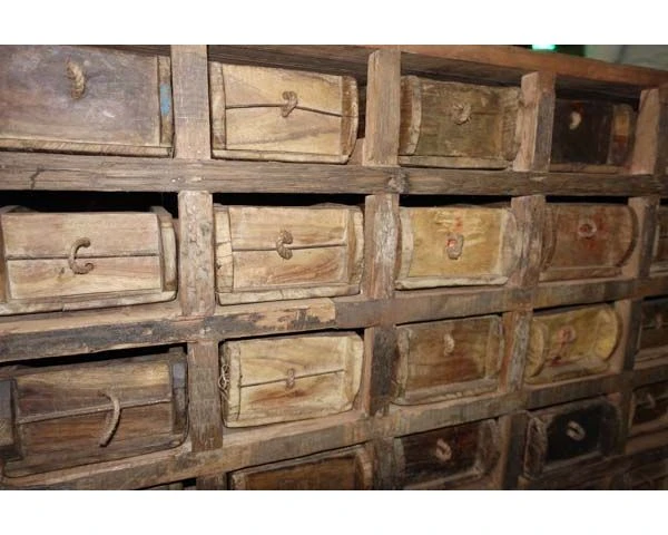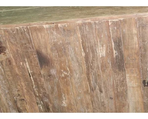 Le plateau de cette commode par exemple reste droit dans l’ensemble mais il ne faut pas s’attendre à avoir avec ce type de produit un meuble parfaitement lisse, sans bosse et sans trou bien au contraire. Les morceaux de bois utilisés conservent les traces de leurs passés et sont délibérément mis en valeur. La récupération est de mise sur cette commode. Les tiroirs sont des anciens moules à brique de terre utilisés en Inde pour la fabrication de bâtiments ou dans la restauration d’anciennes constructions.