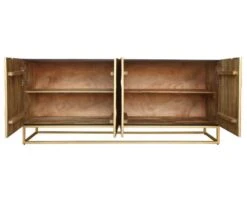 Profitez de ce meuble de rangement gracieux qui vous permettra, en plus de servir d’élément décoratif, de stocker correctement et bien à l’abri votre plus belle vaisselle. Derrière les 4 portes en bois de manguier massif dorées, vos affaires seront rangées de façon idéale. Profitez d’une pièce de vie organisée et nette. Livré partiellement monté, ce buffet métal et bois de 177 cm de long sera très vite installé. En effet, vous n’aurez qu’à fixer les pieds en fer au caisson et le tour sera joué. Vous apprécierez aussi sa facilité d’entretien en l’époussetant de temps à autre à l’aide d’un chiffon doux ou d’une microfibre non pelucheuse.