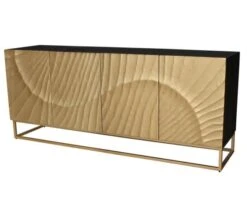 Quand les formes organiques se conjuguent avec des lignes modernes tout en pureté nos intérieurs se voient décorés avec finesse et élégance. Grâce à cette grande enfilade dorée et noire de la collection « Pop Vintage », votre cuisine ou votre salle à manger se fardent d’une note raffinée et magistrale à la fois. Chez Meuble House on adore le motif des portes qui nous fait penser aux rides du sables provoquées par les vagues . Et vous, à quoi cela vous fait-il penser ?