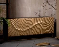 Quand les formes organiques se conjuguent avec des lignes modernes tout en pureté nos intérieurs se voient décorés avec finesse et élégance. Grâce à cette grande enfilade dorée et noire de la collection « Pop Vintage », votre cuisine ou votre salle à manger se fardent d’une note raffinée et magistrale à la fois. Chez Meuble House on adore le motif des portes qui nous fait penser aux rides du sables provoquées par les vagues . Et vous, à quoi cela vous fait-il penser ?