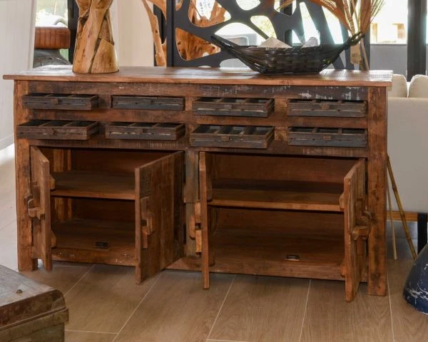 Dans ses tiroirs originaux, vous pourrez pourquoi pas ranger vos couverts, des jeux de cartes ou de société. Derrière les 4 portes fermées par d’impressionnants loquets en métal, vous trouverez une étagère. Vous pourrez ainsi placer dans les placards de nombreuses affaires : linge de table, vaisselle, déco, dossiers, épicerie sèche et tant d’autres ! Vous avez déjà certainement une petite idée de l’utilisation que vous allez faire de votre nouveau meuble de rangement…