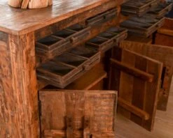 Pièce unique : attention, en raison de sa singularité et de l’emploi de matériaux recyclés, il est important de noter que les tiroirs et les portes peuvent avoir des dimensions et tailles aléatoires. Le système de fermeture des portes et les tiroirs peuvent aussi varier : ils peuvent être en bois ou en métal (voir dernière photo).