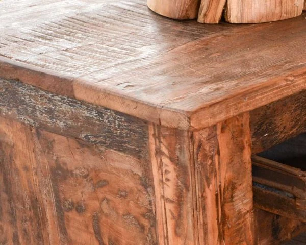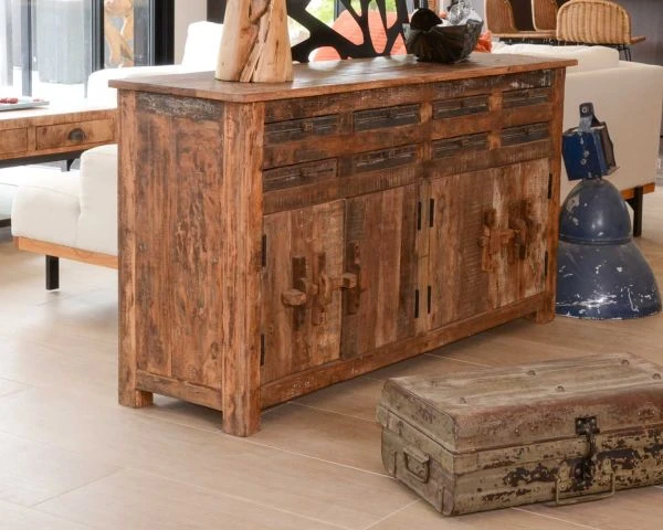 En upcyclant intelligemment du bois exotique de diverses origines, les artisans indiens ont su combiner avec brio les carnations et profils de la matière. Ainsi chaque buffet est aussi élégant que singulier. Vous êtes certains de ne jamais revoir exactement le même exemplaire. Idéal pour vous qui aimez le fait d’être unique !