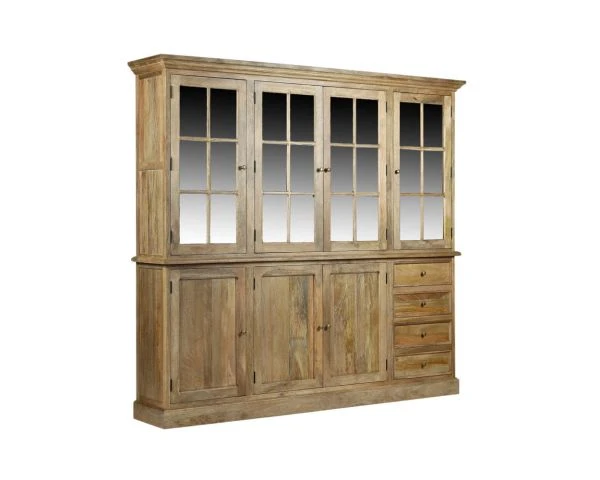 Question rangements, il y a de quoi faire ! Derrière les différentes portes vitrées, vous pourrez exposer fièrement vos livres de collection, vos coupes de champagnes chinées, vos vases précieux… Les quatre tiroirs sur coulisses bois recevront aussi une foule de petits objets comme les couverts, les jeux de cartes, les boites de chocolat (s’il en reste)… Trois portes basses renfermeront vaisselle et plats de service. Surtout les deux portes centrales non séparées par un montant vertical. Trop pratique ! Avec des dimensions de 218 x 203 x 40 cm (L.xH.P.) ce meuble conviendra bien évidemment aux pièces de vie spacieuses. N’hésitez pas à représenter son volume au sol pour visualer son encombrement.
