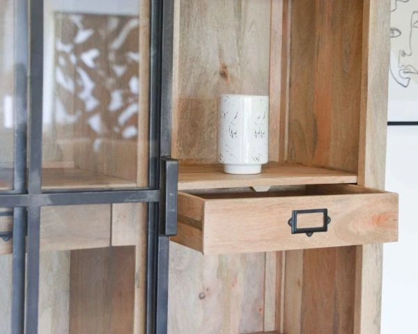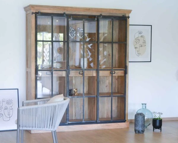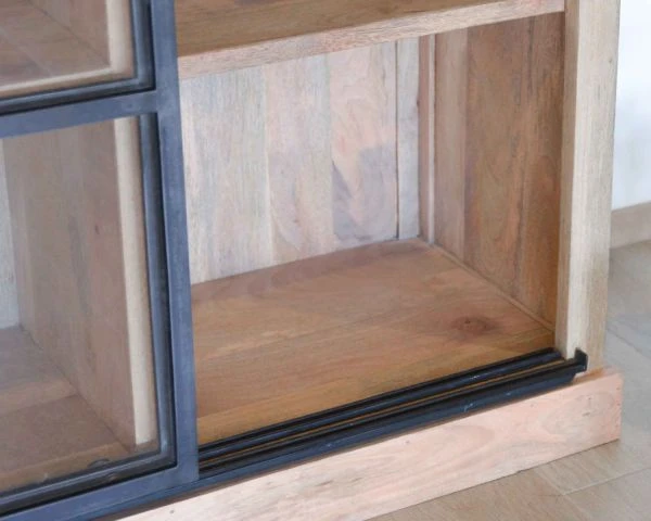 Réveillant à merveille la structure en bois massif, le métal travaillé ici de façon volontairement brut signe la tendance ! Encadrant les vitres des 3 portes coulissantes, cette matière solide se marie à merveille avec le bois naturel de manguier. Essence durable et pérenne, le manguier présente des teintes chaleureuses aux reflets miels ponctuées de stries plus foncées et fines. On craque pour son charme incroyable qui assure l’aspect chaleureux de notre intérieur.