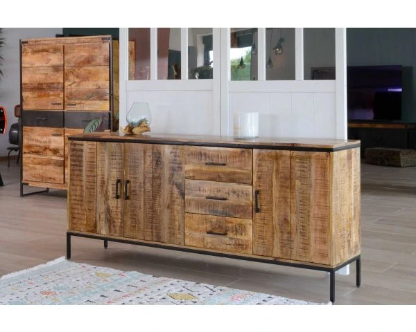 Le buffet industriel « Mango » de L.180xH.80xP.40cm pourra être installé dans différentes pièces de votre maison. Cuisine, salle à manger ou véranda se verront sublimées par ce meuble intemporel qui vous suivra de très nombreuses années. Fabriqué à partir de matériaux solides, il a l’avantage de vous être livré déjà assemblé. Pas mal non ?