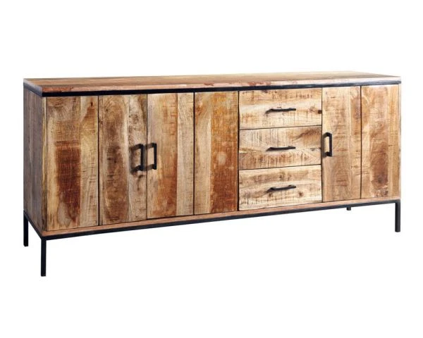 Cette longue enfilade de 180cm met en avant une conception en bois naturel massif. Avec ses teintes chaudes variant du miel clair ou miel foncé et ponctuée de stries fines plus foncées, l’essence de manguier diffuse ses good vibes dans votre cuisine ou dans votre salle à manger. Le plateau souligné d’une ceinture en métal élégante fait écho aux poignées et aux pieds épurés. Le métal, travaillé d’une manière à laisser apparaitre plus ou moins le travail de soudure, permet d’appuyer encore plus la personnalité du mobilier.