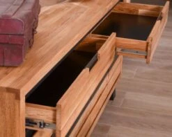 Avec de généreuses dimensions de 200 x 85 x 50 cm (longueur x hauteur x profondeur), cette enfilade en chêne trouve sa place dans les pièces de vie ouvertes ou de dimensions importantes. Attirant tous les regards, il est aussi ultra-pratique et vous apprécierez les beaux volumes offerts par ses 2 tiroirs à ouverture totale et ses 4 portes à frein dissimulant 2 grandes cellules sans montant central. Agréables à ouvrir, les portes et tiroirs vous permettront d’ordonner tous vos couverts, votre linge de table, vos assiettes, vos plats de service et accessoires volumineux… Le buffet moderne « Toly » sera parfait pour vous aider à tenir votre maison organisée. Résistant et durable, ce meuble de la marque Casita est livré assemblé, seuls les pieds seront à fixer avant de pouvoir y ranger vos différentes affaires.