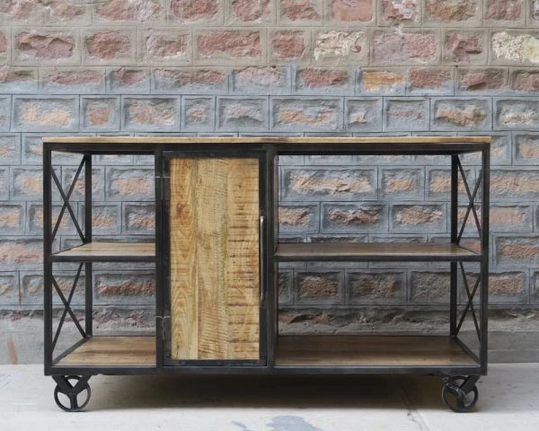En effet, votre nouvel îlot de style industriel est monté sur roulettes, il peut ainsi se déplacer aisément et vous accompagnera dans votre salle à manger. Il se transforme ainsi en un meuble de complaisance permettant à vos invités de se servir à leur guise et évitant les déplacements incessants jusqu’à votre cuisine pour profiter de l’instant de manière sereine. Vous apprécierez sa structure métallique qui lui confère robustesse et originalité. Ajoutez à son plan de travail une porte centrale dédiée au rangement, ainsi que 4 étagères ouvertes, et vous obtenez un îlot mobile, fonctionnel et modulable qui s’adaptera à tous vos besoins pour votre plus grand plaisir !