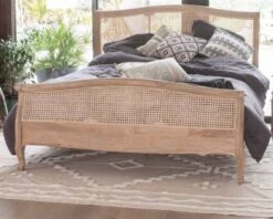 Un cadre en bois sculpté avec minutie, un travail remarquable de cannage au niveau de la tête de lit et du bout de lit, des courbes tout en élégance magnifiées par la douce teinte du bois de manguier. Voilà en quelques mots le signe d’un travail artisanal de qualité réalisé avec soin.