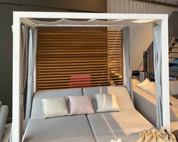 Matières : Tissu Sunbrella®, garnissage mousse, voilages, teck et aluminium