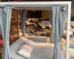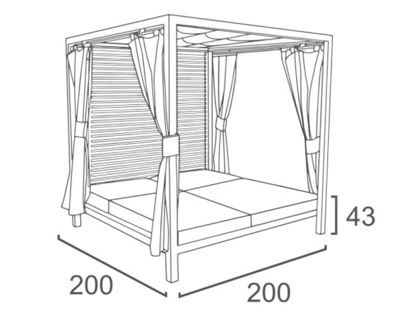 Ses généreuses dimensions de 200x200x210 cm (P.xL.xH.) en font un meuble fabuleux et en même temps accueillant et aérien grâce notamment aux voilages et à la structure en aluminium. Traité contre la corrosion, c’est un matériau plus résistant et plus léger que le métal et entièrement recyclable.